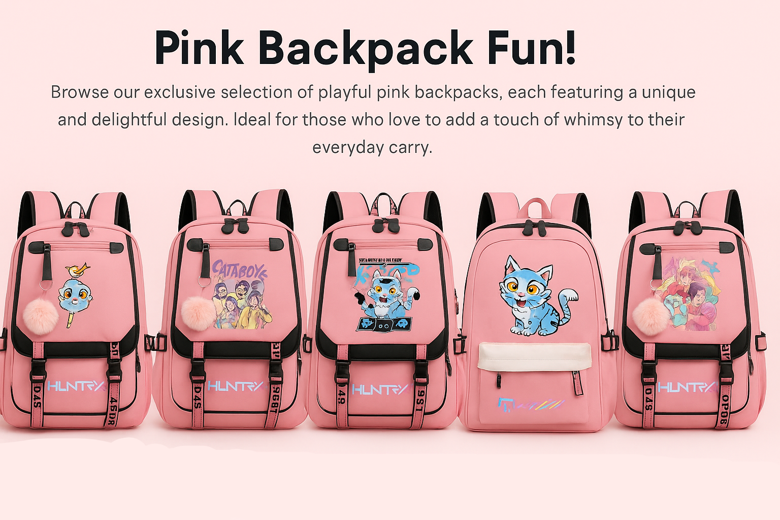 Trendy pink backpack with vibrant K-Pop fan-art, USB charging port, headphone jack, and spacious pockets. Stylish, functional, and perfect for school, travel, or concerts.